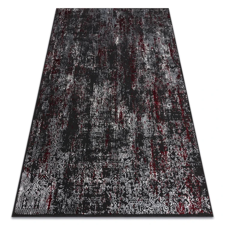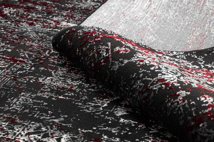 Antracytowy dywan z abstrakcyjnym wzorem i czerwonymi akcentami, który doda salonowi nowoczesny charakter.