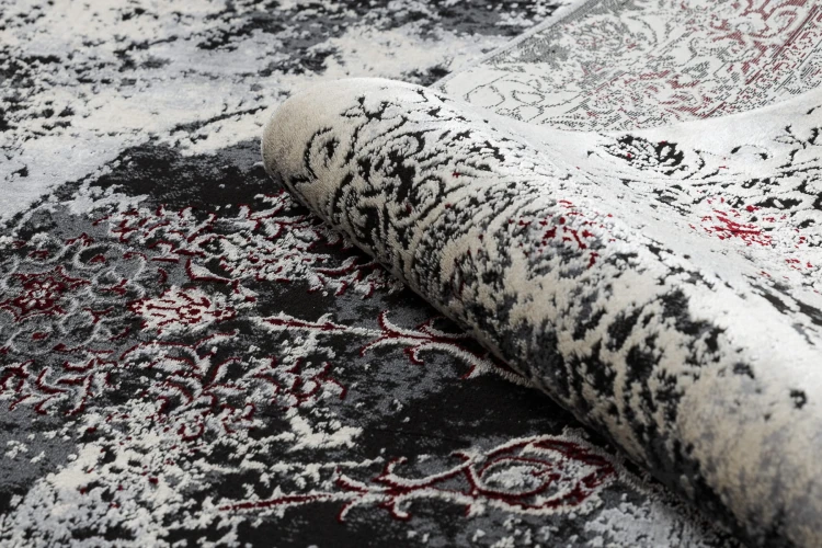 Szaro-czerwony dywan z abstrakcyjnym wzorem, który doda wnętrzu wyrazistego charakteru i doskonale sprawdzi się w salonie.