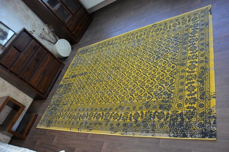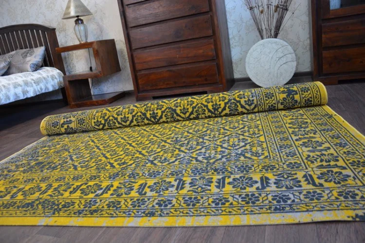 Żółty dywan z kwiatowym wzorem, który ożywi salon lub pokój ciepłym, słonecznym akcentem.