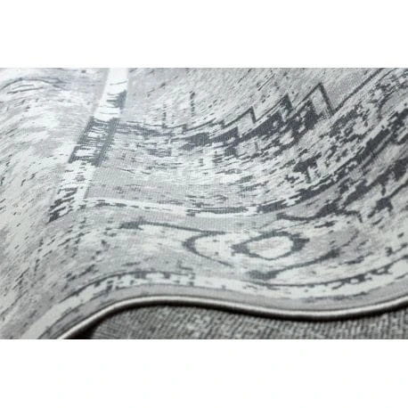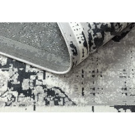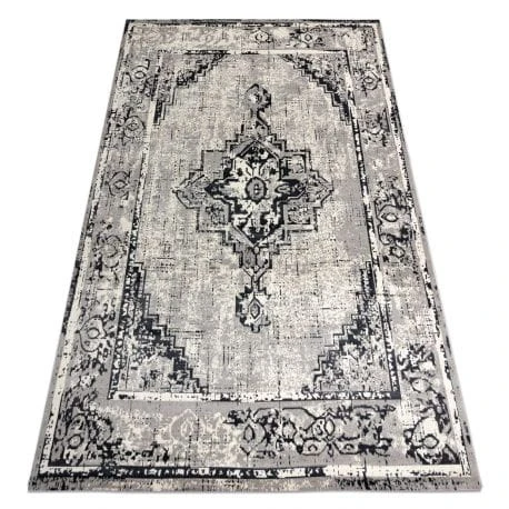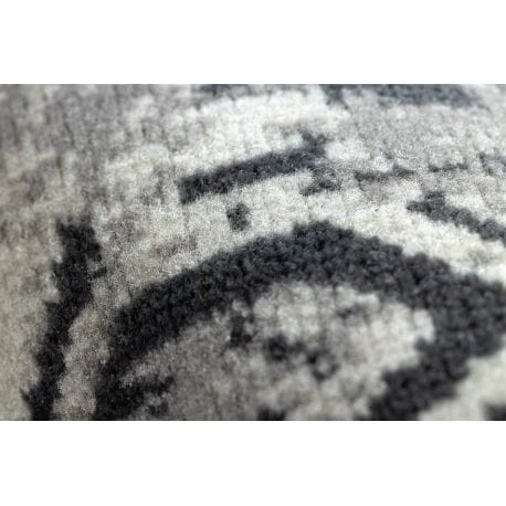 Szaro-czarny dywan z abstrakcyjnym wzorem rozety, który doda salonowi nowoczesny charakter i wyrazisty akcent.