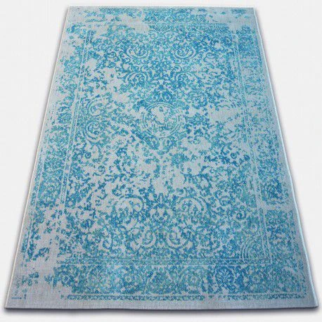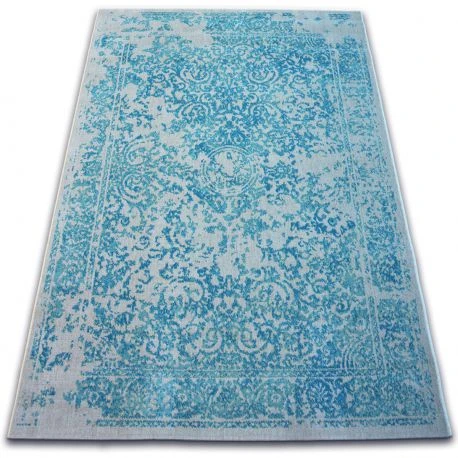 Turkusowy dywan z abstrakcyjnym wzorem, który wniesie do wnętrza świeży, energetyzujący akcent kolorystyczny.
