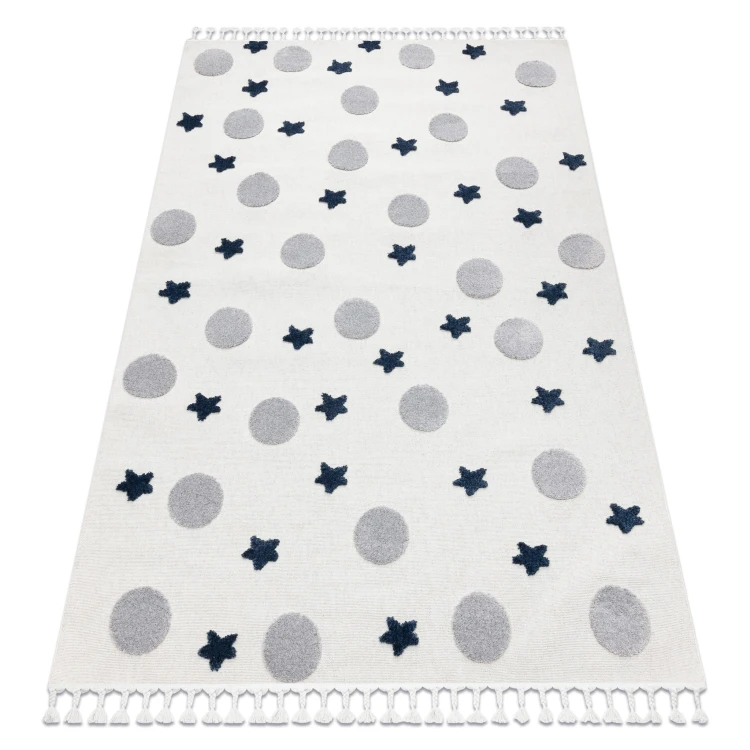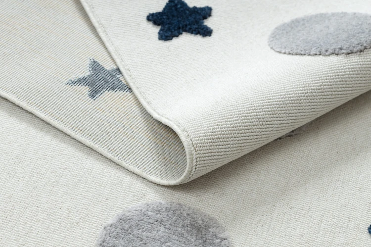 Szary dywan z motywem gwiazdek, który idealnie sprawdzi się w pokoju dziecka, tworząc spokojną atmosferę do zabawy i odpoczynku.