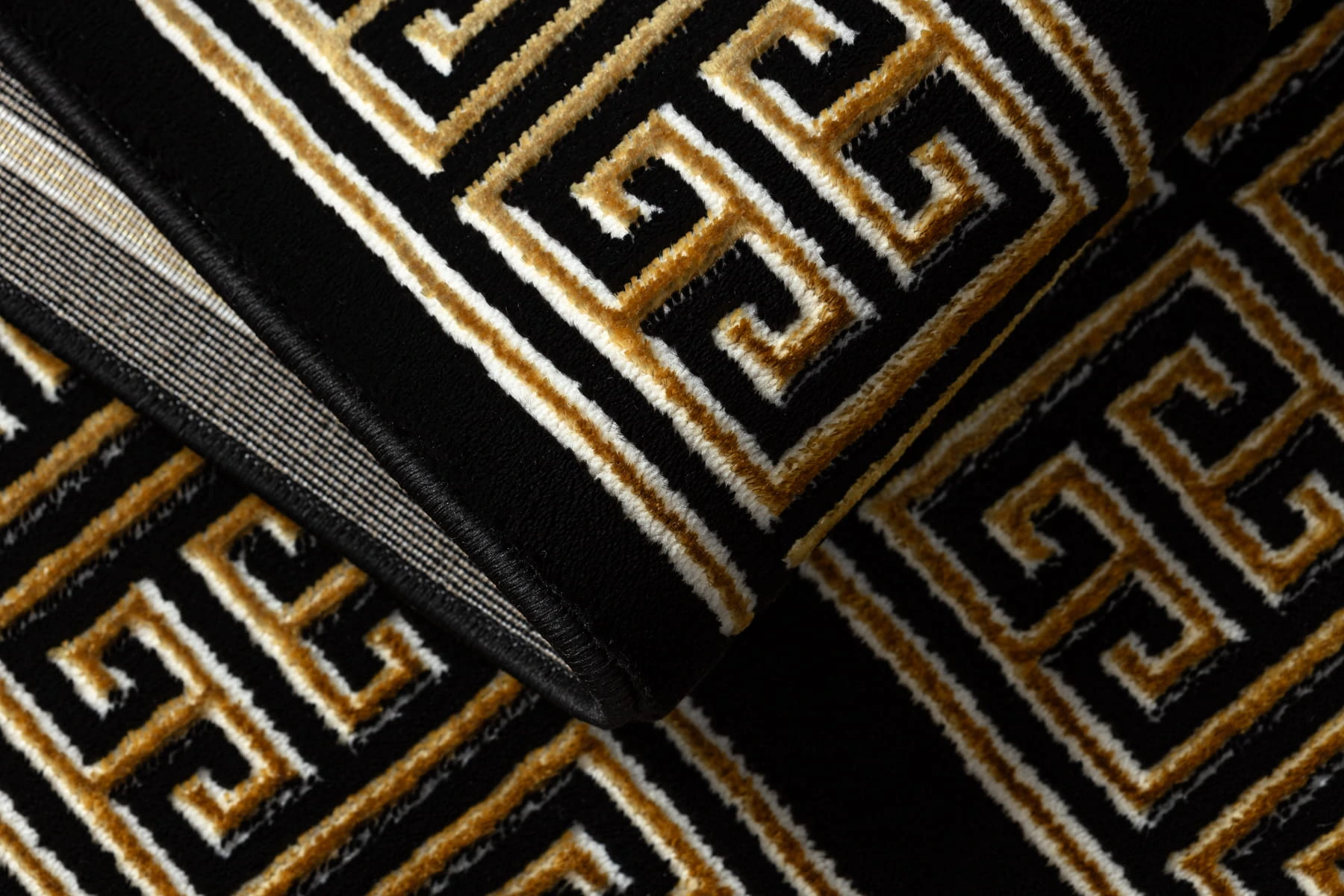 Czarno-złoty dywan z klasycznym wzorem greckiego klucza w ramce, który nada korytarzowi elegancki, tradycyjny charakter.