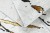 Biało-złoty dywan z abstrakcyjnym wzorem, który doskonale sprawdzi się w długim korytarzu, nadając mu elegancki charakter.