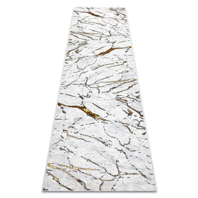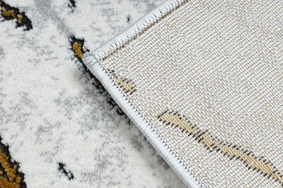 Biało-złoty dywan z abstrakcyjnym wzorem, który doskonale sprawdzi się w długim korytarzu, nadając mu elegancki charakter.