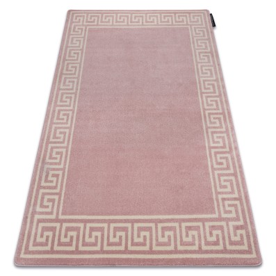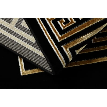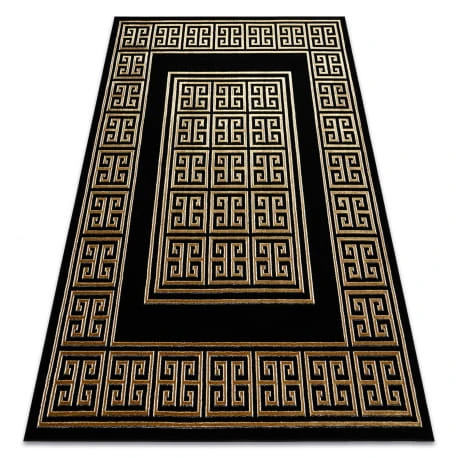 Czarny dywan z klasycznym wzorem greckiego klucza w złotej ramce, który nada salonowi elegancki, glamour charakter.