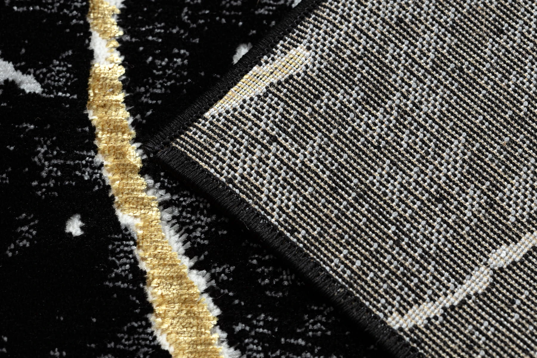 Czarno-złoty dywan z abstrakcyjnym wzorem marmurkowym, który nadda korytarzowi elegancki i nowoczesny charakter.