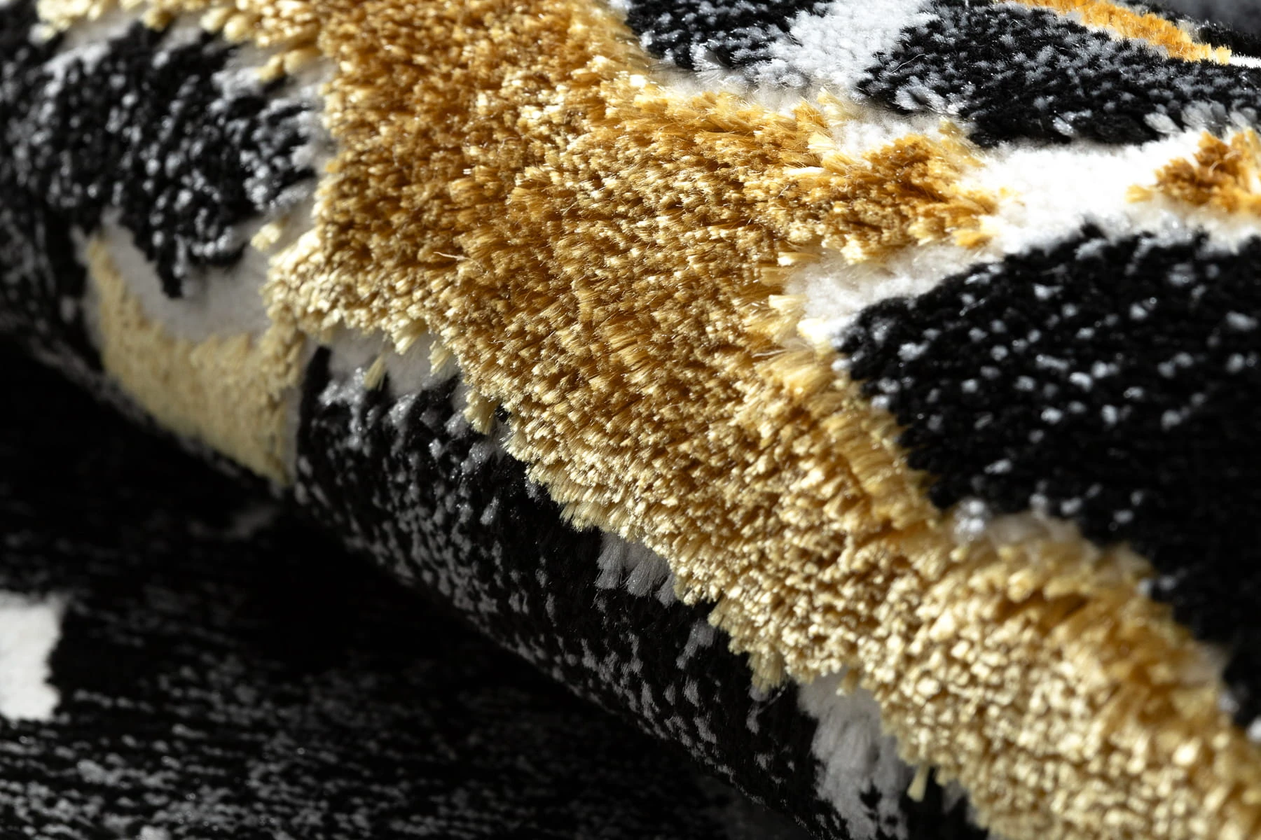 Czarno-złoty dywan z abstrakcyjnym wzorem marmurkowym, który nadda korytarzowi elegancki i nowoczesny charakter.