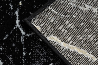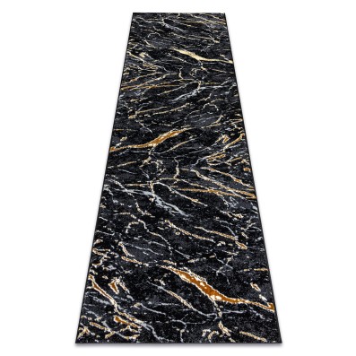 Czarno-złoty dywan z abstrakcyjnym wzorem marmurkowym, który nadda korytarzowi elegancki i nowoczesny charakter.