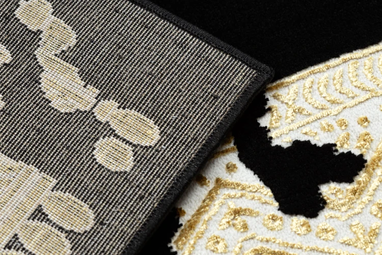 Czarny dywan z ozdobną złotą ramką, który nada korytarzowi elegancki charakter i podkreśli jego długość.