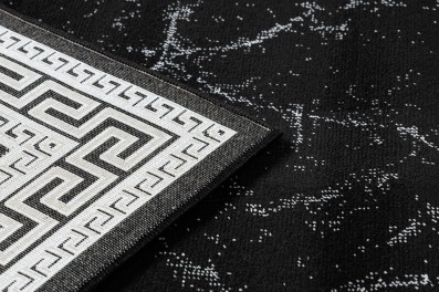 Czarno-kremowy dywan z klasyczną ramką w greckim stylu, który nadaje korytarzowi elegancki charakter.