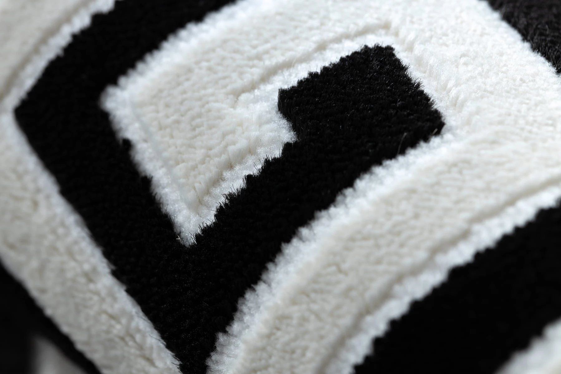 Czarno-kremowy dywan z klasyczną ramką w greckim stylu, który nadaje korytarzowi elegancki charakter.