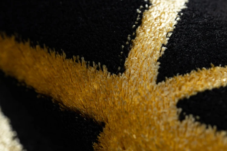 Czarny dywan z efektownym 3D wzorem sześcianu w złocie, który nada korytarzowi nowoczesny i elegancki charakter.