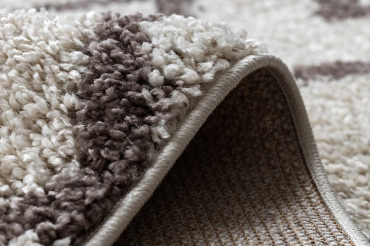 Kremowy dywan shaggy z runem 20 mm i tradycyjnym geometrycznym wzorem, który nada korytarzowi ciepły, berberyjski charakter.