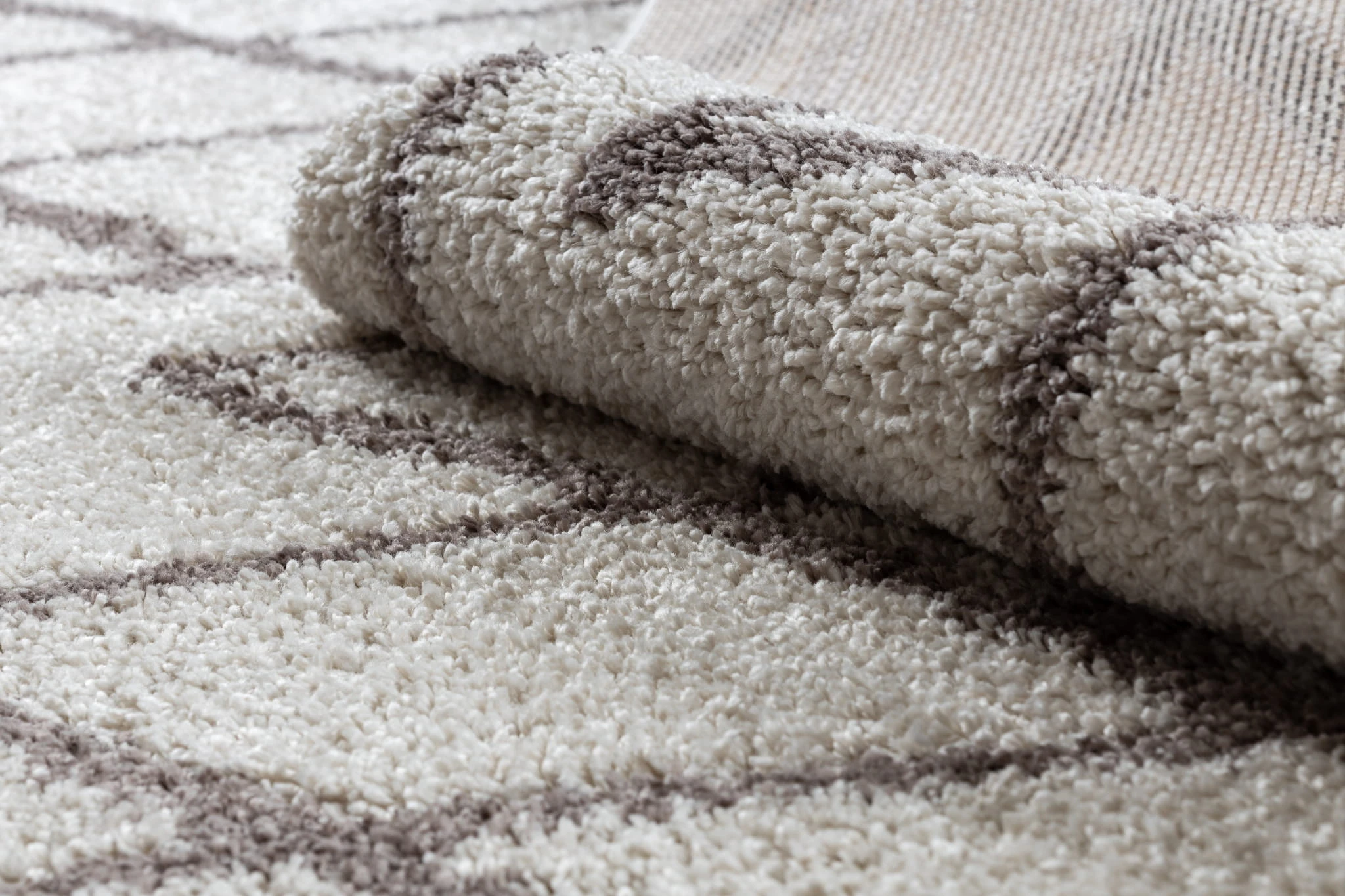 Kremowy dywan shaggy z runem 20 mm i tradycyjnym geometrycznym wzorem, który nada korytarzowi ciepły, berberyjski charakter.