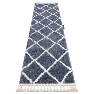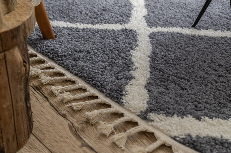 Szaro-biały dywan shaggy z geometrycznym wzorem i runem 20 mm, który idealnie wypełni korytarz, nadając mu marokański charakter.