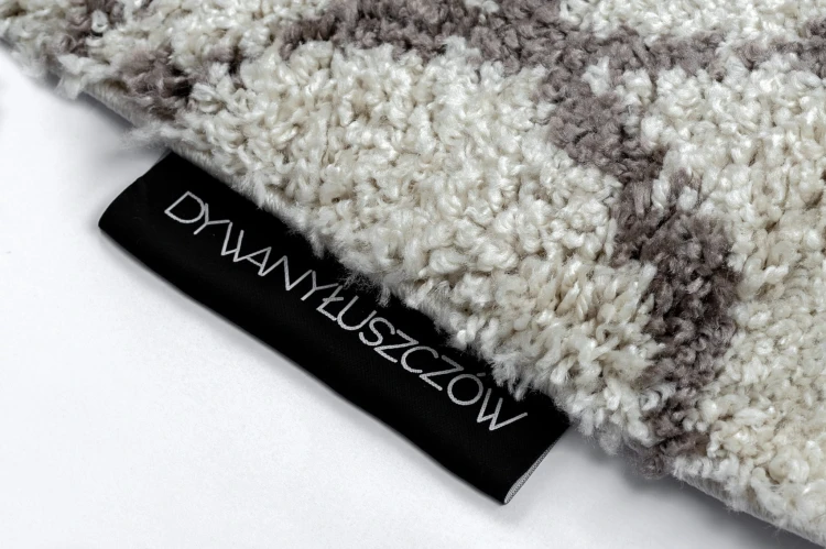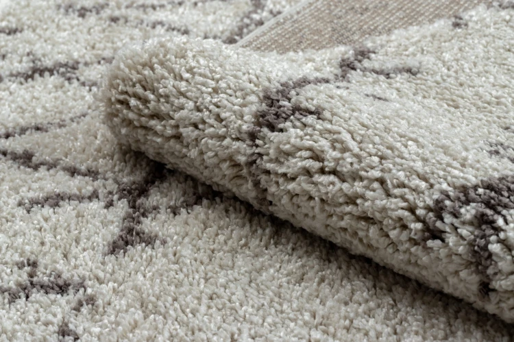 Kremowo-brązowy dywan shaggy z runem 20 mm i berberyjskim wzorem geometrycznym, który idealnie wypełni długi korytarz, dodając mu tradycyjnego charakteru.