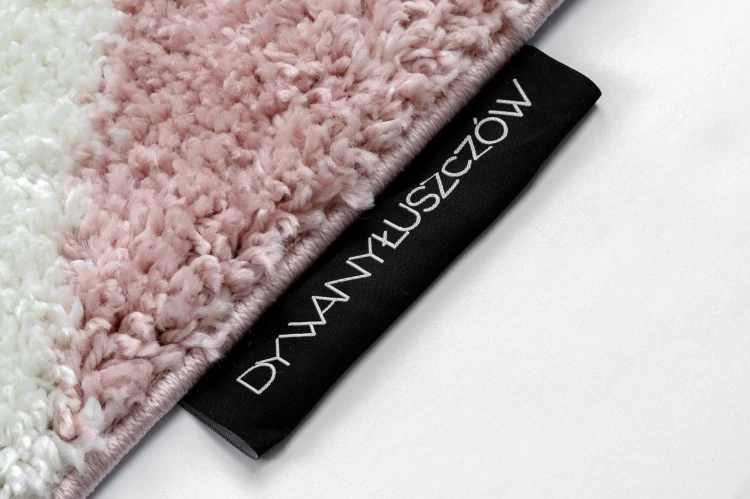 Różowo-biały dywan shaggy z runem 20 mm i tradycyjnym wzorem geometrycznym, który nada korytarzowi ciepły, przytulny charakter.