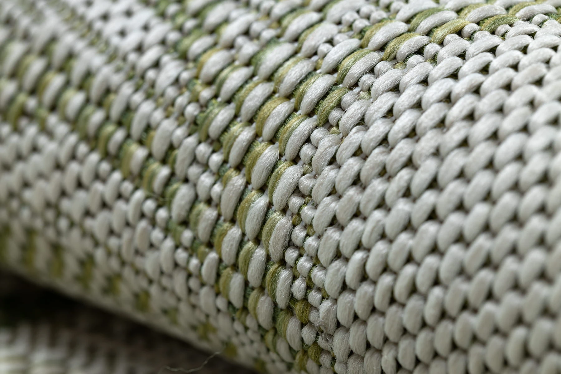 Kremowy dywan sznurkowy z zielonymi motywami roślinnymi, który wprowadzi do korytarza naturalny, egzotyczny klimat.